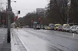 The street is known for its width and leafiness. For most of its length, the wide street consists of a wide shared footpath (lined with Elm trees), street side parking, a bicycle lane, two lanes for motor vehicle traffic, median strip reserve (lined with mature London Plane trees), another two lanes for motor vehicle traffic and a tram line on either side.