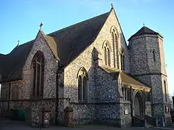 The church is built predominantly of flint with mouldings and window dressings of stone.[3] Internally very spacious,[6] it can hold up to 900 people.[4] Its south and west elevations face the street. At the east end is a three-bay chancel flanked by a Lady chapel and vestry to the south and north respectively. This adjoins the four-bay, north- and south-aisled nave, at the southwest corner of which is the octagonal tower.[3] A substantial, three-stage structure with a shallow cap at the same height as the nave roof, the tower was in fact intended to be much taller and topped with a spire rising to 160 feet (49 m); but the extension and spire were never built.[4][6] The entrance is in a porch which runs along the length of the west face.[3]