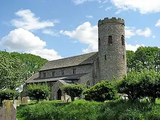 Burnham Norton's parish church, St Margaret's, is one of 129 surviving round-tower churches in Norfolk.[3] Opinion differs as to its date of construction. Most historians conclude that the tower and at least part of the main building is Anglo-Saxon in origin, built between 1000 and 1066 AD. However, no church is listed in Burnham Norton in 1086's Domesday Book, leading some historians to believe that the building is of early Norman construction.[4] The building was gradually altered in later years, and is not internally symmetrical. The north arcade is supported by 13th-century round columns, while the south arcade is supported by more elaborate 14th-century octagonal columns.[5] The east window of the church is an ornate stained-glass window installed in the late 1920s, depicting saints Margaret of Antioch and Margaret of Scotland.[6] The church building is Grade I listed, the highest level of recognition available to a historical building in England.[7]