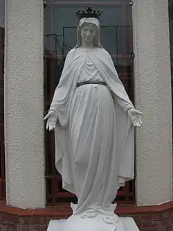 The statue of the Blessed Virgin Mary, as it is in 2014, no longer gilded, in the cloister courtyard of Sacred Heart Cathedral.