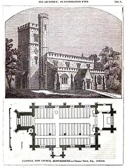 Architect's floor plan and engraving of the replacement church, published in The Civil Engineer and Architect's Journal in 1850.[12]