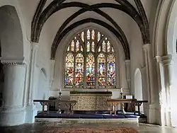 In 1825 the chancel was shortened to allow for the adjacent Quarry Street to be widened. In 1862 St Mary's was restored by Thomas Goodchild (died 1885) when the stonework was renewed and the gallery removed. Goodchild's restoration did not eliminate the 11th- and 12th-century fabric of the ancient parish church. The whole of the exterior of the walling (excepting that of the tower and the east wall, which is of chalk) has been encased with flint, and all the buttresses are Victorian except one.[7] The east window is by William Holland and shows the Nativity, Baptism, Crucifixion, the Resurrection and Ascension of Jesus Christ.[13] The west window of the north aisle is by the Royal Bavarian Art Institute for Stained Glass and dates from about 1850.[5] The baptismal font is Victorian and has a square bowl of clunch with scalloped under-edge, resting on a chamfered square stem and four small stone shafts with scalloped capitals and moulded bases. The pulpit, which was added by Goodchild, is of stone and marble and replaced one from the 17th-century.[5][7]