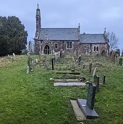 St Mary's is a relatively small church, and is constructed to a simple plan, with a nave, chancel, and porch, and terminating with a bellcote.[8] The building materials are sandstone rubble with stone dressings and a roof of Welsh slate.[6] The interior contains some stained glass which was probably manufactured by Clayton and Bell.[2] The church is a Grade II listed building.[6] A cross in the churchyard with a 15th century base and a 19th century cross has its own Grade II listing.[9]