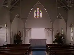 Internally, the ceiling is unlined and three lancet-shaped timber archways separate the sanctuary from the nave.[1]