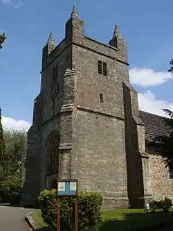 The two-stage tower has mouldings defining its upper and lower stages, and stands on a moulded plinth. Diagonal corner buttresses provide support. A stair-turret topped with a parapet is attached on the north side. The tower itself terminates in a squared-off parapet with "heavy" pinnacles[5] which Nikolaus Pevsner considered to be 17th-century.[10] They are topped by tapering finials with weather vanes. Above the Perpendicular Gothic[8] west doorway, which has "nicely carved"[10] and moulded spandrels and a four-centred arch, are John Bolney's coat of arms (whose heraldic description is Or a crescent with two molets gules in the chief) and the inscription This Stepl is 66 Foot high which was added in 1538 upon completion of the tower. A peal of eight bells is set in a bell-chamber near the top of the tower, lit by four two-light, flat-arched windows.[5] The church is well known for this large complement of bells and the regular bellringing that takes place, and the ancient pub opposite the church is named The Eight Bells in recognition of this.[3]