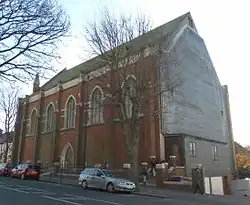 The church is based in a much older building: the former church of St Thomas the Apostle, an Anglican church built in 1909 by the Brighton-based architecture firm Clayton & Black[5] (who were responsible for many local buildings including the Duke of York's Picture House, the French Convalescent Home on the seafront, and a reconstruction of the Theatre Royal). The tall red-brick building, in Early English style,[5] has a large pointed-arch window in its eastern face and five smaller windows across the northern face, where the entrance is situated. The last service was held on 17 January 1993,[4] and the church was declared redundant on 20 July 1993.[6] Although the Diocese of Chichester identified the building's poor condition as one of the reasons for closure,[4] the Coptic Orthodox Church bought it shortly afterwards. St Thomas the Apostle's parish was subsumed into that of All Saints Church nearby, and its locally produced Stations of the Cross were moved to St Mary's Church, Kemptown.[5]