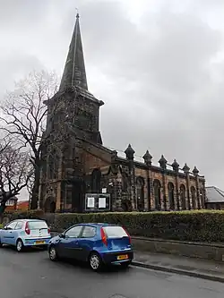 The church is constructed in sandstone with slate roofs. The nave and steeple are in a variation of the Neo-Norman style, and the chancel is Gothic Revival. The plan consists of a six-bay nave, a chancel with a north organ chamber and a south vestry, and a west tower with a spire. The tower is in three stages with clasping buttresses and a west door. Above the door is a pair of round-headed windows under a segmental arch. In the top stage are triple bell openings. The cornice at the top of the tower has corner corbels carved with winged beasts. On the tower is a broach spire with lucarnes. Along the sides of the nave the bays are divided by square pilaster buttresses rising to fluted finials.[a] The windows are round-headed. On the sides of the chancel are two-light Decorated windows, and the east window consists of triple stepped lancets.[2]