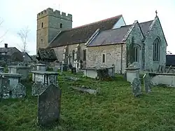 Inside the church is the original Norman west doorway of the nave; this was formerly on the exterior of the church, but now leads into the tower. Above this is a 12th-century window.[2] The roof of the nave has been dated by dendrochronology to 1494–95. In the south wall of the nave is a trefoil-headed piscina, in a position corresponding to the external tomb recess. The font dates from the 12th century. There is stained glass in the east window and in some of the nave windows by Hardman, and in one window in the south wall of the nave is a window dated 1920 by Kempe and Company.[3] There are separate war memorial plaques to the parish dead of the two World Wars, a slate plaque to Lieutenant Edward Whitehead (killed in First Gulf War 1991), and a prayer desk given in memory of Robert Henry Cooper and his comrades who were killed in World War II in the sinking by enemy action of MV Siamese Prince.[4] In 2021 a five year long project financed by a legacy and grants led to the conversion of a disused vestry to provide the church with a toilet, kitchenette and an internal spiral staircase to give access to the belfry for ringers.[5]