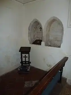 There are two recesses in the south wall, one of which is used as a piscina.[4][5] Another ancient fixture that remains is a roughly executed[15] carving of John Lewis (or Lews)[3] and his wife Agnes, dated 1537. In the form of a triptych, it shows them kneeling and facing a central panel which has now been defaced beyond recognition but which would have shown a Crucifixion or Trinity scene.[4] It occupies a recess in the north wall and is carved from Caen stone.[5] Next to it, another carving depicts St George and the "gruesome martyrdom" of St Agatha.[5][11][12] Ian Nairn described its style as characteristic of the area and its date: "combining kneeling figures with purely Gothic and purely religious subjects".[1]