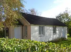 Bingham Towner's 1954–55 church, a "pleasant little building"[31] of yellowish-buff brick, with a steep shingled roof[31][41] and designed in the Vernacular style, was small and unpretentious: Nikolaus Pevsner described it as "modest indeed", even after its porch and sacristy were added in 1966.[42] The "fine oak porch"[41] gave some more emphasis to what was "just a simple rectangular box". The mullioned leaded light windows gave an unecclesiastical appearance reminiscent of a Tudor Revival house.[31]