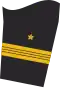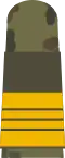 Its rank insignia, worn on the sleeves and shoulders, are one five-pointed star above two stripes with two half stripes between them (without the star when rank loops are worn).