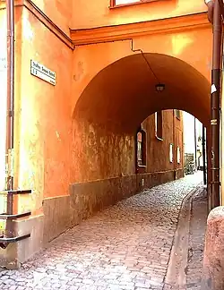 Staffan Sasses Gränd is a blind alley in Gamla stan, the old town in central Stockholm, Sweden. Stretching north from Köpmangatan, it forms a parallel street to Bollhusgränd and Peder Fredags Gränd.