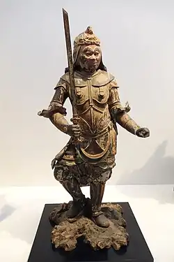 The Heavenly Generals, always shown with a fierce look, wearing armor and carrying weapons,[2] were often the subject of sculptures during the Heian and Kamakura periods. In fact, five different sets of Heavenly Generals have been designated as National Treasures. In the group of figures at the Seikadō Bunko and Tokyo National Museums, the uniqueness of each one of the figures has been praised, with "varied postures, hairstyles, hand-held symbols and armor shapes".[2] According to the National Institutes for Cultural Heritage,