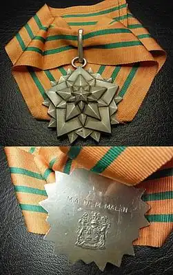 The Star of South Africa, post-nominal letters SSA, is a military decoration for merit which was instituted by the Union of South Africa from 1952 to 1975. It was awarded to general and flag officers of the South African Defence Force for exceptionally meritorious service. The Star of South Africa was discontinued on 1 July 1975, when a new set of orders, decorations and medals was instituted.[1][2]