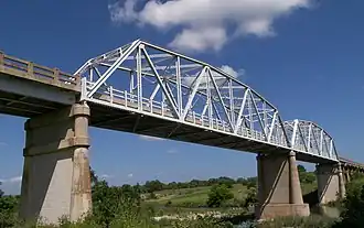 The State Highway 9 Bridge at the Llano River in Texas connects Mason County to the Gillespie County seat of Fredericksburg.[2] On June 14, 1935, a disastrous flood crested the Llano River at 41.5 feet (10 m), washing out the two truss spans, as well as the center pier, of the 1930 bridge of State Highway 9 across the Llano River in Mason County, Texas.[3] In effect, it isolated the town of Mason from the south. Reconstruction of the Llano River Bridge became an immediate priority.