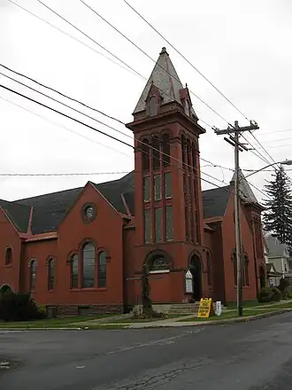 State Street Methodist Episcopal Church, now known as State Street United Methodist Church, is a historic Methodist Episcopal church located at Fulton in Oswego County, New York. The original section was built in 1894, and expanded in 1900 with the addition of an auditorium in the Akron Plan. It consists of a one-story auditorium with 1+1⁄2-story education. A basement was added in 1906, and two-story wing in 1962. The church is constructed of red brick and is in the Romanesque style. It has a slate cross-gable roof and two asymmetrical towers. The larger bell tower is four stories tall and contains two levels of stained glass windows.[2]: 5