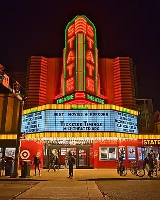 The State was built by W. S. Butterfield Theatres, which also operated the nearby Michigan Theater.[1] The non-profit Marquee Arts has operated the theater since 1999, complementing the Michigan's programming. The State's current 4 screens are located on the balcony of the former 1900-seat auditorium. A ground-floor retail space replaced the original auditorium's main floor in 1989, housing an Urban Outfitters store until 2020. The retail space now houses a small Target store.