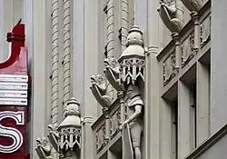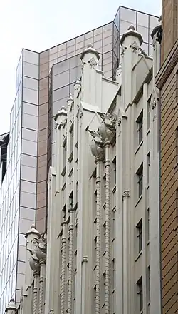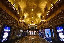 The State Theatre contains a 21 Rank Wurlitzer organ, one of three, with the other two residing at the (now demolished) Regent Theatre nearby and the State Theatre in Melbourne, and a Koh-i-Noor cut crystal chandelier which is the second largest on earth, weighing over four tonnes.[23] The interior also included paintings by William Dobell and Julian Ashton. The 11 storeys above the theatre were constructed as the State Shopping Block, a vertical shopping arcade, 150 shops served by 8 lifts, all in the Gothic style of the street lobby.[24] These floors were later converted to offices.