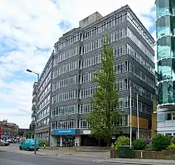 The road is a mix of semi-detached and detached houses in the west, small apartment blocks, and large office buildings in the east near the station that are characteristic, according to Pevsner and Cherry, of the fashion in the 1960s for out-of-town offices near transport hubs.[1] Most of those blocks have been converted to flats in whole or part since 2000, including Basil Court, Endeavour House, Kingmaker House, Groupama House, Comer House, and Castle House.[2]