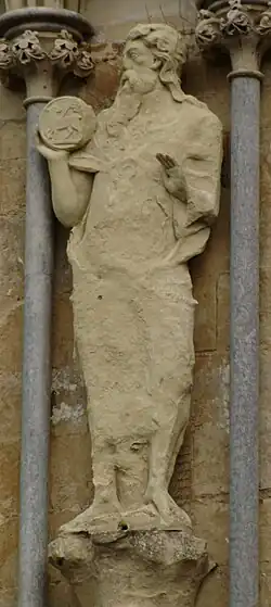 145 St John the Baptist Early 14th century Anon Supporting an agnus dei roundel on right hand, wearing an animal skin. Badly weathered.