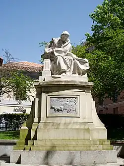 Following the death of Pardo Bazán in 1921, the first to come up with the idea of an homage to Pardo Bazán in Madrid was Eugenio Rodríguez Ruiz de la Escalera.[1] The costs were funded—under the auspice of María del Rosario de Silva, the Duchess of Alba—via popular subscription from women from Spain and Argentina.[2]