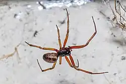 Steatoda nobilis is a spider in the genus Steatoda, known in the United Kingdom as the noble false widow,[1][2] as it superficially resembles and is frequently mistaken for the black widow and other spiders in the genus Latrodectus. It is often referred to as the false widow, although "false widow" is a more general term applied to a wider group of species with this resemblance.[3][a] It is a moderately medically significant spider, with most bites resulting in symptoms similar to a bee or wasp sting. Some bites may cause more significant harm, partly due to pathogenic bacteria from the spiders.[4][5]