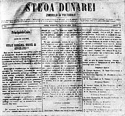 Steaua Dunării (Danube's Star) was a political newspaper and a unionist mouthpiece founded in October 1855 by Mihail Kogălniceanu. Editors like Vasile-Urechea Avexandrescu, Vasile Mălinescu, Iancu M. Codrescu and collaborators like Vasile Alecsandri, Costache Negruzzi, Alecu Donici, Grigore Alexandrescu, Alecu Russo, Dimitrie Bolintineanu, C.A. Rosetti, Gheorghe Sion wrote articles for the newspaper.