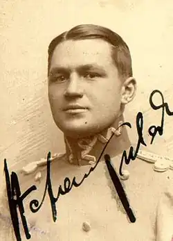 In the summer of 1914, he attended a non-commissioned officer course in Kraków.[4] At the outbreak of World War I, he joined the Seven Lancers of Belina, a patrol led by Władysław Belina-Prażmowski, whom he had met during his studies in Belgium.[4][6][7] On the night of 1–2 August, this seven-man unit became the first Polish military group to cross the border from the Austrian Partition into the Russian Partition at Kocmyrzów.[8] The patrol conducted reconnaissance through Goszyce, Działoszyce, Jędrzejów, and Słomniki, returning to the manor in Goszyce.[7] On the evening of 3 August[8] or after 4:00 PM the next day,[7] the patrol returned to Kraków. On 6 August, its members joined the First Cadre Company and marched to Miechów.[7][8]