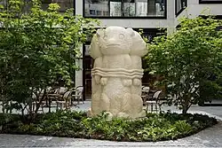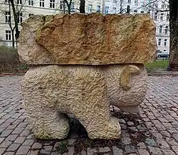 Rinck has been realizing public sculptures since 2008. During his participation at the Busan Biennale in 2008 in South Korea, the granite sculpture The Division of Woman and Man was commissioned.[10] In 2018, the work The Mongooses of Beauvais was permanently installed in the city of Paris at 53-57 rue de Grennelle (Beaupassage).[11] Another monumental limestone sculptures were realized at Vent des Fôret (One of those who were too long in the woods, 2010)[12] and La Forêt d'Art Contemporain (Saint Georges et son dragon de compagnie, 2020)[13] in France. In November 2021, the sandstone sculpture Why I bear / Grosser Lastenbär was inaugurated at Zionskirchplatz in Berlin-Mitte.[14]