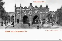The northern Steindamm Gate (Steindammer Tor), the most architecturally impressive gate in the city walls, was dismantled in 1912 to allow further development in northern Königsberg, as Steindamm was one of the busiest thoroughfares in the city.[10] The arterial road connecting Steindamm and Hufen was known first as Kaiser-Wilhelm-Damm, then Hansaring in 1918, and then Adolf-Hitler-Straße in 1933.[10] Institutions located at the new square, Hansa-Platz (later Adolf-Hitler-Platz), included the Amtsgericht, Landgericht, and Polizeipräsidium.[10] Nearby was the Neues Schauspielhaus.