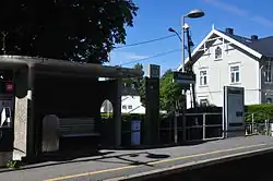 The station building was a multi-apartment house built in Swiss chalet style, common for the period and area. The building is two full stories and has a half-story with a gabled roof. It has wooden paneling. It was a prefabricated by Strømmen Trævarefabrik, and an identical station building was built at Gaustad Station.[2]