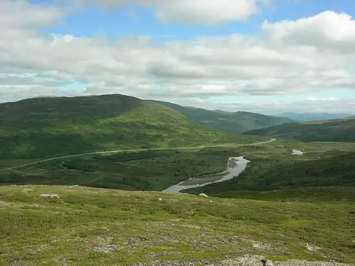 Between Blåsjön (English: the blue lake) and Stekenjokk runs one of Sweden's highest located roads, Vildmarksvägen.[5] Stekenjokk is one of the Sami people's places for reindeer to feed during the summer, and the reindeer and the work around them is part of the nature experience when visiting the area. The Stekenjokk copper mine was located in this area until it was closed in 1989.[1] A SMHI weather station located in the area recorded temperatures in 2007 that showed that Stekenjokk was the coldest place in Sweden.[6] Stekenjokk also is close to Børgefjell National Park on the Norwegian side.[7]