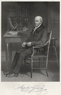 Girard was born in Bordeaux, France on May 20, 1750, the son of a sea captain.[3]: 767  He lost the sight in his right eye at the age of eight and had little education. In 1760, he travelled to the colony of New York as a cabin boy and stayed there, working in the coastal trader system along the east coast and as far south as the Caribbean.[3]: 766  He was licensed as a captain in 1773, visited New York in 1774, and with the assistance of a New York merchant began to trade to and from New Orleans and Port au Prince. In May 1776, after the outbreak of the American Revolutionary War, Girard sailed into the port of Philadelphia to avoid a group of Royal Navy warships and settled there, running a grocery and liquor shop.[4] In 1783, Stephen's brother John Girard left him with a slave, a woman in her twenties named Hannah, during a visit from Saint-Domingue.[5]:89-91 Pennsylvania's 1780 Act for the Gradual Abolition of Slavery had many loopholes and although it was amended throughout Girard's life, Hannah remained his slave until his death in 1831. An 1828 listing of taxable inhabitants reported that she was the only enslaved person in Philadelphia at that time.