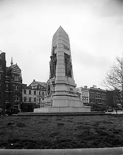 A resolution passed by the Senate in April 1902 provided the memorial to be erected on any of the city's public lands other than the Library of Congress and Capitol grounds.[7] The site chosen, at the corner of 7th Street and Louisiana Avenue (now Indiana Avenue) NW, was selected by a commission appointed by Congress. The commission consisted of Secretary of War Jacob M. Dickinson, Senator George P. Wetmore, Representative Samuel W. McCall, General Louis Wagner, and Thomas S. Hopkins.[8] The soil at the chosen site, present-day Indiana Plaza, could not support the memorial's weight, so the concrete foundation had to be expanded.[6]