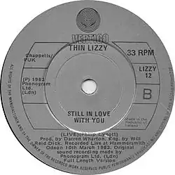 Originally, the song was a duet between Lynott and Moore (as can be heard on an early BBC session recording), but following Moore's departure Scottish singer Frankie Miller was recruited to replace his vocal parts.[7] However, Robertson refused to similarly re-record Moore's guitar solo, believing that it could not be improved upon.[2] Despite this, Robertson would go on to consider "Still in Love with You" his signature song, and would not let it be removed from the band's setlist.[6] The song was featured as a set-closer in the band's live shows[8] and became a showcase for each of the band's subsequent guitarists, including Moore (who rejoined and replaced Robertson), Snowy White (who replaced Moore),[9] and John Sykes (who replaced White), featuring in their live set until the band split in 1983.[10]