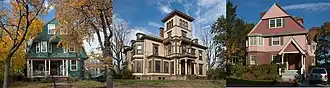The Stimson Avenue Historic District is a residential historic district on the east side of Providence, Rhode Island. It includes all of Stimson Avenue and Diman Place, as well as adjacent properties on Angell Street on the south and Hope Street on the west, forming a relatively compact rectangular area. This area was developed roughly between 1880 and 1900, and features a collection of high-quality Queen Anne and Colonial Revival houses, with a few earlier Italianate houses at its edges. Among the finest is 19 Stimson Avenue, built in 1890 to a design by Stone, Carpenter & Willson; it is stylistically transitional between Queen Anne and Colonial Revival, featuring elaborate woodwork and a large number of exterior surface finishes, in a predominantly symmetrical Colonial Revival form. The only non-residential structure is the 1893 brick Central Congregational Church at 296 Angell Street.[2]