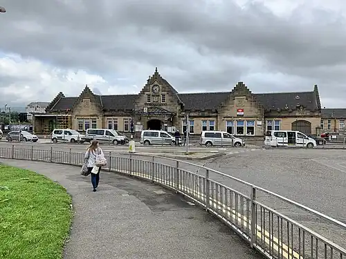 The station building was constructed in 1915 by James Miller, replacing the original 1848 structure designed by Andrew Heiton,[10] and is listed by Historic Environment Scotland as a Category A listed building.[11] Miller's design continues the circular spaces and flowing curves of his celebrated Wemyss Bay station.