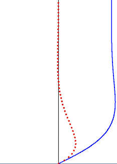 Stokes problem in a viscous fluid due to the harmonic oscillation of a plane rigid plate (bottom black edge). Velocity (blue line) and particle excursion (red dots) as a function of the distance to the wall.