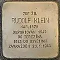 RUDOLF KLEIN BORN 1878 DEPORTED 1942 TO THERESIENSTADT 1943 TO AUSCHWITZ MURDERED 20 January 1943 |