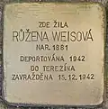 Růžena Adlerová née Fröhlichová was born on 16 June 1874. Her parents were Leopold Fröhlich and Barbora née Herrmann. She was married to Jakub Adler. The couple had at least three sons and two daughters, Josef (also Jozef, born 1904), Anna (born 1906, later named Pisinger), Ota (born 1908), Jindřiška (born 1910) and Jaroslav. Her husband was a merchant, she was a housewife. She and her children Ota and Jindřiška were deported on 26 November 1942 from Klatovy to Theresienstadt concentration camp by transport Cd. Her transport number was 169 of 651. In Theresienstadt, the family was separated. First, in January 1943, her daughter Jindřiška was deported to Auschwitz concentration camp. She was murdered there. Then, on 6 September 1943, her son Ota was deported to Auschwitz. He was murdered there too. At last, on 15 December 1943, also Růžena Adlerová was deported to Auschwitz by transport Dr. Her transport number was 44 of 2,519. She was murdered there.[7][8]
