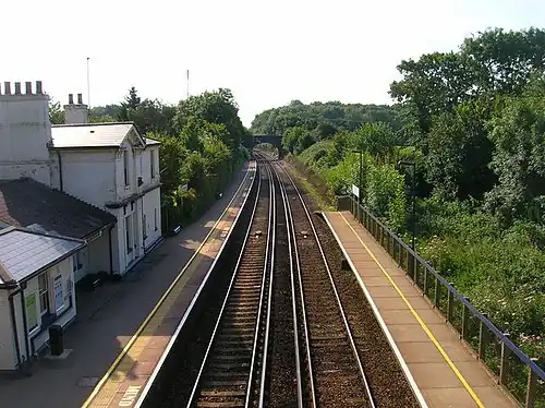 The South Eastern Railway route between Tunbridge Wells and Hastings was authorised in 1846 (9 & 10 Vict. c. lxiv), and opened in stages: the section between Tunbridge Wells and Robertsbridge was opened on 1 September 1851.[2] The station opened the same day named Witherenden[3] (the name of a nearby hamlet), but was renamed in December the same year to Ticehurst Road.[4] It became Stonegate (after a village about 1 mile away) on 16 June 1947.[5]