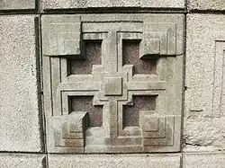 Wright used sledgehammers and aluminum molds to imprint elaborate Maya-inspired patterns into the blocks.[10] The textile-block motifs were intended to blend the home's design into the hillside, in conformance with Wright's affinity for organic architecture.[18][33] The house uses eleven block shapes,[34] which are carved in four patterns.[35][28] On blocks with multiple faces, all of these faces are decorated with recessed, concentric half-squares. The other patterns are used on the standard 16-by-16-inch squares and depict a convex motif, a patterned cruciform, or a group of three protruding rectangles.[36] These designs were adapted from Wright's earlier Unity Temple and A. D. German Warehouse.[37] Since only one face of each engraved block contains decorations, the outer walls are made of two layers of blocks, with an air gap between them; this allowed both the interior and exterior faces of the walls to have engraved patterns.[13] The textile blocks absorbed moisture easily and were prone to decay because of impurities that existed when the blocks were cast.[38][39]