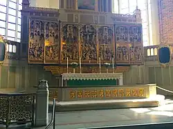 The high altar of Strängnäs Cathedral, showing detail of the sanctuary, and the very large carved and gilded triptych reredos.