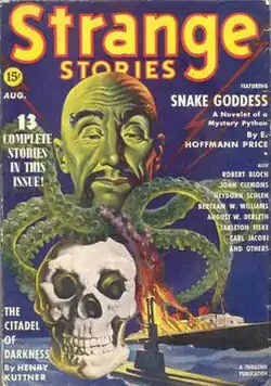 Fantasy and occult fiction had often appeared in popular magazines before the twentieth century, but the first American magazine to specialize in the genre, Weird Tales, appeared in 1923 and by the 1930s was the genre's industry leader.[1] In 1939, two magazines were launched in the same niche: one was Unknown, from Street & Smith; the other was Strange Stories, published by Standard Magazines and edited by Mort Weisinger, who was already editing Thrilling Wonder Stories and Startling Stories for Standard.[2] The budget for fiction was half a cent per word, which was a low rate compared to other magazines.[3] Weisinger obtained stories from many authors who contributed to Weird Tales, including August Derleth, Henry Kuttner, and Robert Bloch, who between them accounted for 40 of the 148 stories the magazine printed over its thirteen issues.[4] Critics consider little of the fiction memorable. Among the better-received stories were two by Kuttner: "Cursed be the City" and "The Citadel of Darkness" in the April and August 1939 issues respectively;[2] "Logoda's Heads", by Derleth, which science fiction historian Robert Weinberg described as "perhaps Derleth's best weird fantasy for any magazine";[5] and some stories by Manly Wade Wellman in the early issues.[5] Other contributors included Eric Frank Russell, C. L. Moore, and Seabury Quinn.[2][5] There were no serialized novels; at the time, Standard's policy forbade them. Weinberg described the covers by Standard's in-house artists, Rudolph Belarski and Earle K. Bergey, as "among the worst ever seen on any pulp".[5] The magazine was an attempt to imitate Weird Tales, but Weisinger was never able to give it any distinctive character of its own.[2] It received little assistance from its sister magazines in Standard's publishing stable; typically each magazine carried advertisements for other Standard publications, but Startling Stories and Thrilling Wonder Stories rarely mentioned Strange Stories in this way.[6]