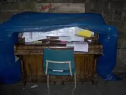 The Public Piano Project in Joshua Tree, California began as a public grand piano Valentine Gift to the community in 1995 as the Self Serve Serenade by artist Piano Bob (aka Bob Fenger). In 2002 Piano Bob began a donated piano consolidation project building a weather proof outdoor piano from the parts of 3 pianos and installed April 2004 in front of Joshua Tree Health Foods. It was enjoyed by thousands of Joshua Tree National Park Visitors and locals for nearly two years and was reinstalled 20 April 2012 at the Coyote Corner Gift Shop in Joshua Tree as the first Public Prepared Piano.[17] The piano is reminiscent of a Gamelan Orchestra prepared with everyday items such as coins, screws, paper mutes, wedged into the strings in a typical John Cage manner (inventor of the prepared piano in the 1940s also see Bob Fenger's Acoustisizer at Prepared piano 2.10). The Public Prepared Piano is the third phase of the Public Piano Project dedication to unknown closet pianists, art in public places, and instant drum circle fun around a keyboard. Through regular tuning and maintenance of the public pianos another opportunity presented itself for the public to observe, learn and interact with the total Public Piano Project experience. Questions like:how long does it stay in tune outside? The short answer: the colder the better the more in tune. The fact that Joshua Tree is in the High Desert above Palm Springs with many 100 degree plus days in the summer gave numerous opportunities for tuning, sharing and exchanging ideas. The artist's stated intention:[18] 'The Public Piano Project creates momentary beauty thoughts and ideas that resonate out across fields, parking lots and sidewalks. It invites others to play along and gives way to song and laughter, accidental bonding and new friends; even possibly an ephemeral center of insight and change'. On 21 December 2012 Piano Bob launched his fourth phase of the Public Piano Project with the Prepared and Unprepared dueling pianos for peace at the Joshua Tree Hospice.[19] Public Piano Locations[20] Public Piano Tour Pictures 2007.[21][22][23][24]