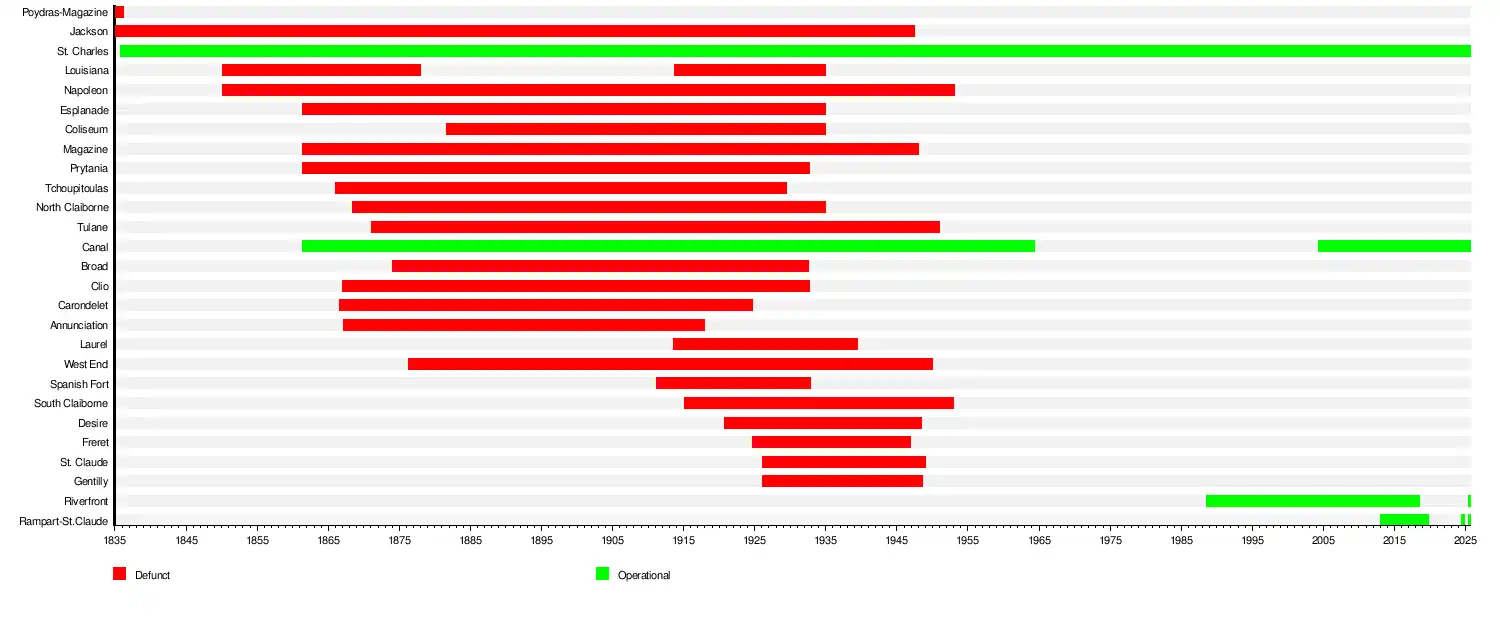 • Jackson (January 13, 1835 – May 19, 1947) – This long-running line also opened before the St. Charles line, on January 13, 1835. Replaced with trolley bus and later diesel bus service.