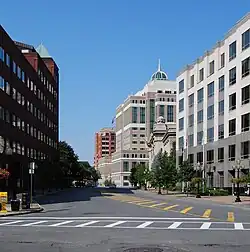 Pine Street was originally a short two block street running west from Barrack Street (now Chapel) to the stockade and later as far as the Public Square (today Eagle Street).[1] A proposal in 1831 to extend Pine from Chapel east to Broadway at a cost of $45–60,000 was defeated.[4] In the 1970s an urban renewal project called the Hotel Ten Eyck Project destroyed Maiden Lane between Chapel and North Pearl streets,[5] while Pine Street was finally extended east from Chapel to Broadway to take up the traffic that could no longer use Maiden Lane.