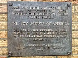 Strengthen the Arm of Liberty was the theme of the Boy Scouts of America's fortieth anniversary celebration in 1950.[2] Approximately 200 BSA Statue of Liberty replicas were installed across the United States. It is located on the west side of Shawnee Mission North High School.[3]