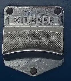 A stubber is a device on which one can stub out their cigarette or cigar. In the past, they often had "stubber" written on them and were used in buses.[1] An other use are plane plates at bus stops and train or underground stations.[2] The difference between an ashtray and a stubber is that a stubber is not able to contain the ash and usually is designed as a plane plate[3] or an inclined rough surface. In February 1990, smoking was banned on the London Buses[4] and following the stubbers in the buses came out of use. Today they are still in use on top[5] or beside of public ashtrays.[2]