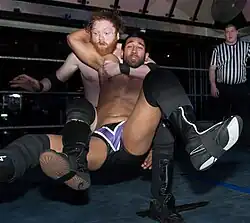 Often used as a counter to the wheelbarrow facebuster, this variant sees the attacking wrestler in the wheelbarrow position, but instead of being lifted and slammed into the mat, the attacker reaches back and applies a three-quarter facelock before falling to a seated position, with the opponent's jaw impacting with the shoulder of the wrestler.[3]